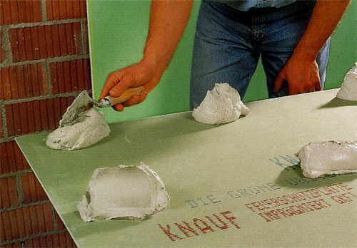 - Knauf Fugen. This composition is used for gluing plasterboard to the surfaces of walls that do not have defects. It has a plastic consistency. It is applied very thinly.