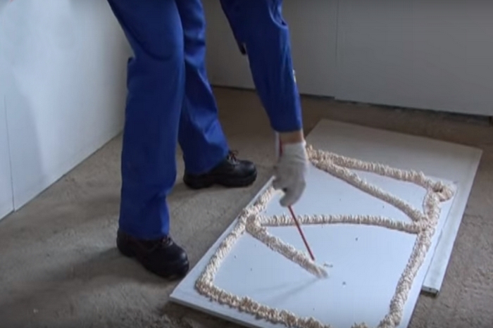 - Apply around the perimeter and in the middle of the sheet solid strips of glue with a notched trowel. At the same time, it is necessary to prevent the glue from going to the joint of the sheet.