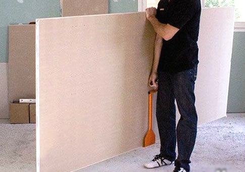 It is necessary to transfer the material vertically together. Otherwise, drywall may break.To move you need to support it from the bottom side, not letting it sway. Professional loaders usually use a special device (a kind of hook). Due to it, it is more convenient to transfer drywall.