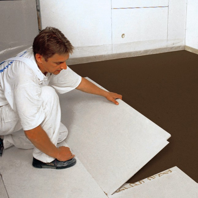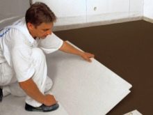 - Start the installation of gypsum fiber materials. Installation of the base floor of gypsum-fiber plates of medium size. This is a simple and fast process, representing the laying of plates of small and medium sizes, which need to be fastened to each other by folded edges. If the ends of the plates are not folded, then simply lay the plates in two layers so that the joints of the plates of the first and second layers do not coincide. The most commonly used plates with a thickness of 1 to 2 cm, rectangular 1.5 mx 1 m.