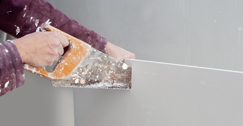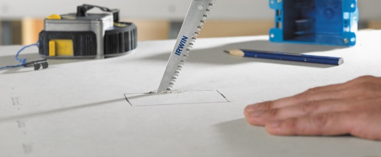 Tools that can and should be used when cutting plasterboard materials include construction knife with replaceable blades (the blades must be at least 12 mm thick) or a special hacksaw that allows you to cut GVL with almost no dust (you can also use a regular sharp hacksaw, but in this case dust will be necessary).