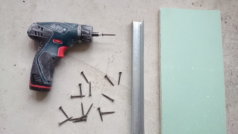 For work, you will need the following tools and materials: a knife or handsaw, tape measure, mounting glue, various spatulas (notched and common), sealing tape, construction tape, level, self-tapping screws, special screws for GF, dowels. Lighten and speed up the jigsaw and drill.