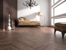 In more modern interiors are often laid porcelain, imitating parquet. As a rule, rectangular elongated plates are used for this. On large tiles there is an imitation of several parquet plates. Such coatings are able to imitate different types of parquet masonry, but depending on the type of such pattern, its price varies. More sophisticated models are quite expensive, but outwardly they look presentable.