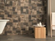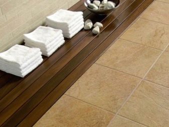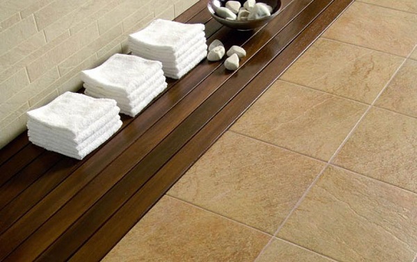 In the modern interior is very fashionable looks porcelain with a design under the laminate. This is an excellent solution if you want to arrange wood floors in the bathroom, but there is no possibility to use them, because they do not meet the quality requirements. That is why you can choose the so-called lamellas of porcelain, imitating laminate. The floor will also look modern and presentable, and the characteristics of low water absorption and high durability of porcelain stoneware will be preserved. It will completely imitate laminate in both color and design, and in texture, and even to the touch. But this cover is quite expensive. The difference will be only in the surface temperature of such a floor.