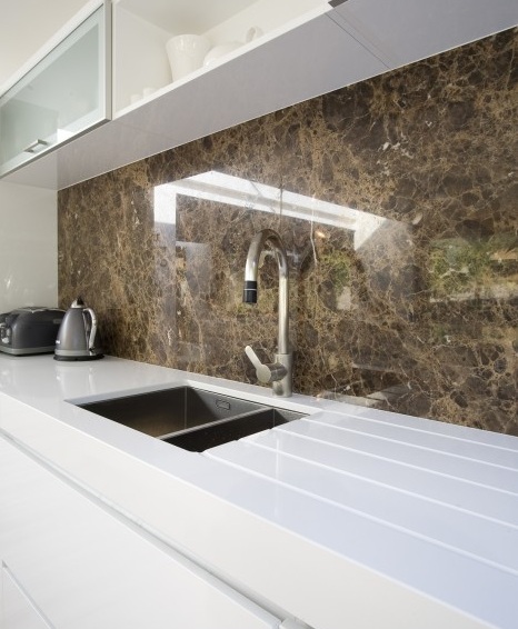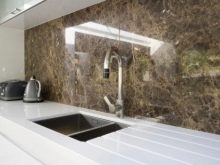 For more recent interiors use bright porcelain green, blue or yellow. It is also used for finishing the kitchen, but, as a rule, only for accent finishing. Colored porcelain can be laid in mosaic or patchwork. Such a bright decor will surprise any guest, and rich colors will not let you get bored.The kitchen apron area can be decorated with mirror granite using the panel technique and the same plinth.