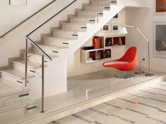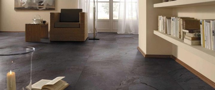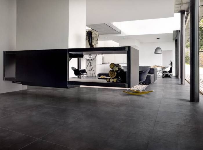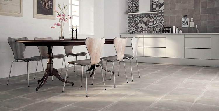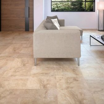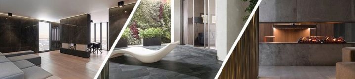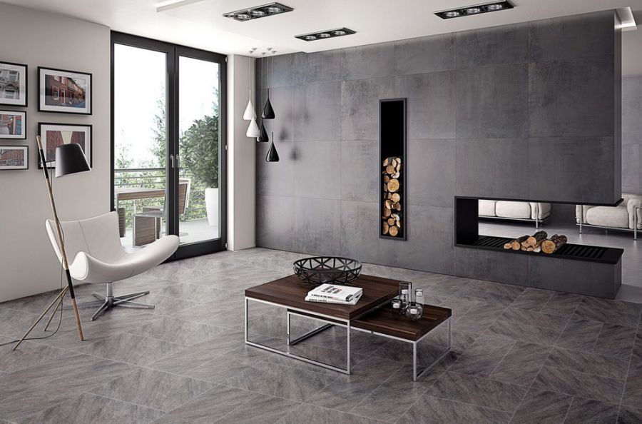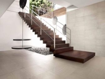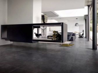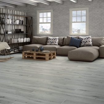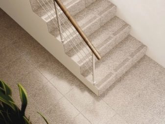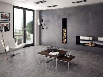 In modern interiors in the style of hi-tech, minimalism or loft, laying ceramic granite under concrete is popular. Basically, this interesting design solution is presented in gray and beige shades, which in color and texture completely imitate this coating. Externally, it looks stylish and original.