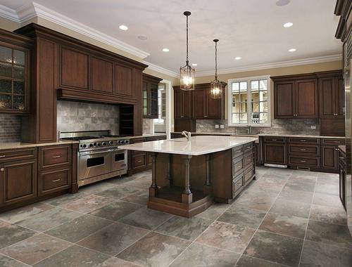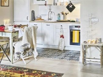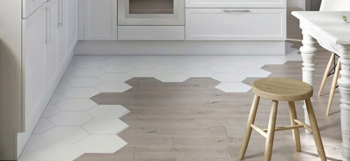 Thus, the workspace will be decorated more safely and without risk of damaging the floors, but in the dining area there will be a more comfortable warm floor, which also costs much less.With the help of such a coating, you can practically arrange the floors in the room, as well as produce a competent zoning due to the interesting design of this material. It is only important to carry out the correct joining of porcelain tiles and laminate.