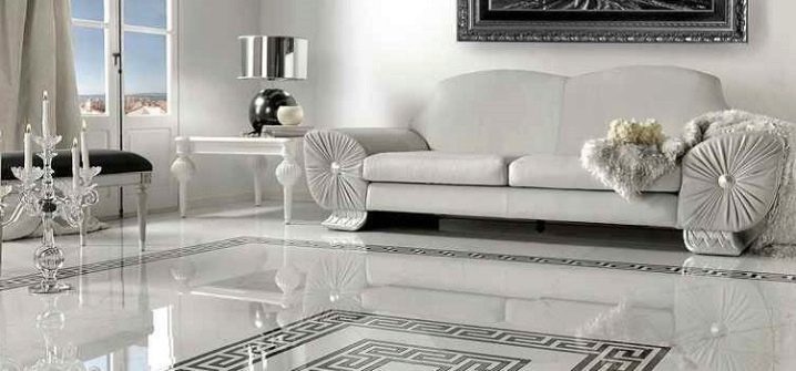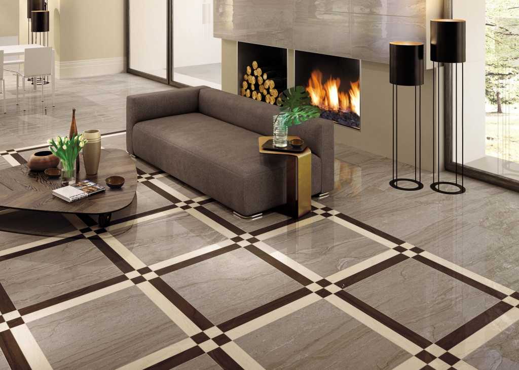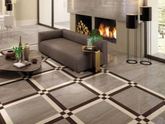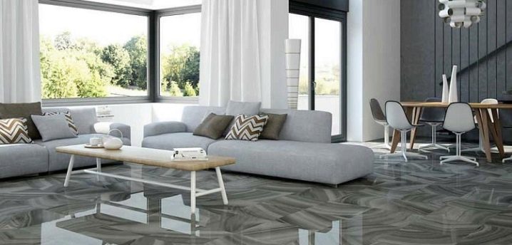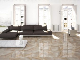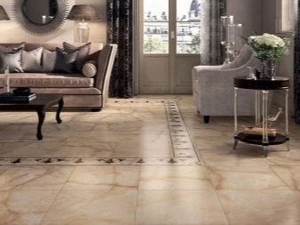 For the living room you can buy beautiful seamless porcelain stoneware. As a rule, such floors look whole and beautiful. The tile is trimmed at the plants on the ideal parameters. Thus, when laying the joints will not be visible. Monolithic stoneware in the living room will look very stylish and organic.