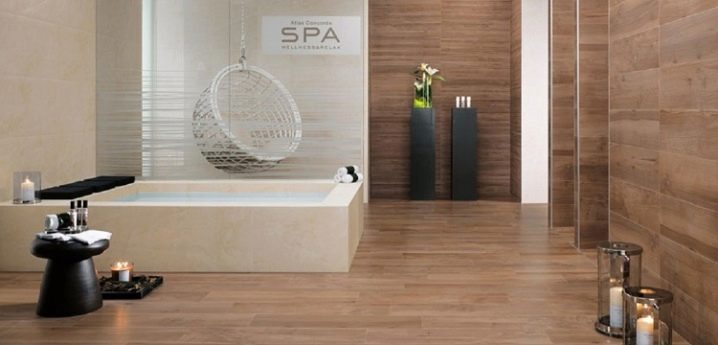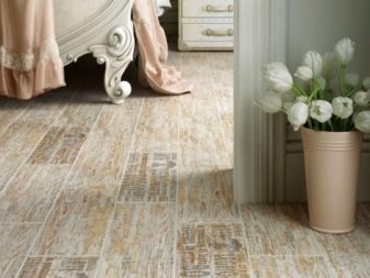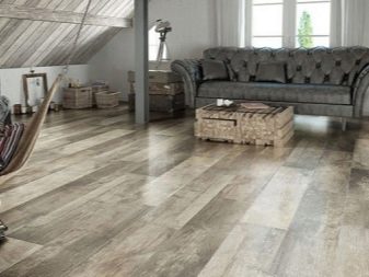 Tiles of porcelain, imitating the floorboard, can bring the atmosphere of a cozy rural home to the interior of the room. Often they are specially made rough, with imitation of cracks, knots or aged wood. These species can perfectly fit into any style of a city apartment, especially polished, with the textures of noble wood - ash, beech, rosewood.