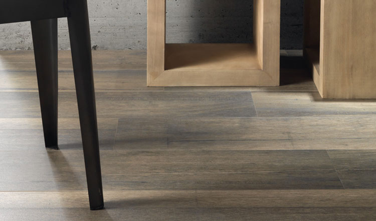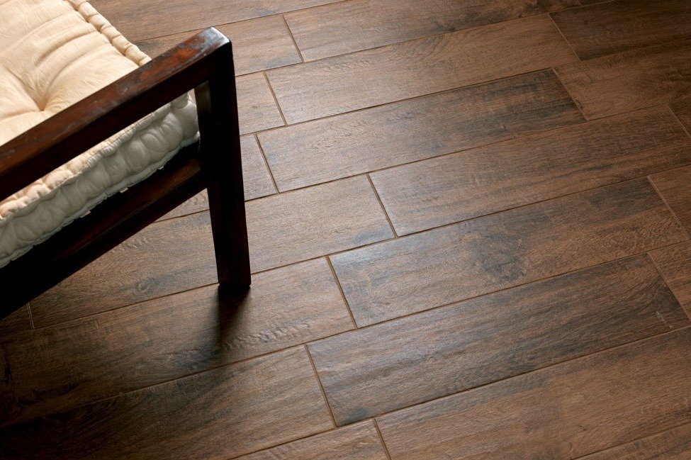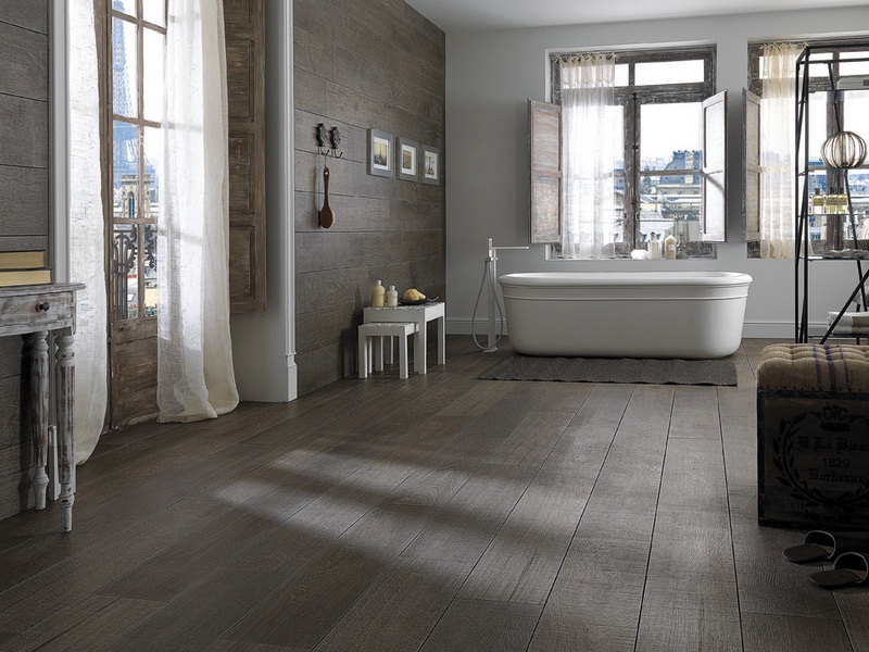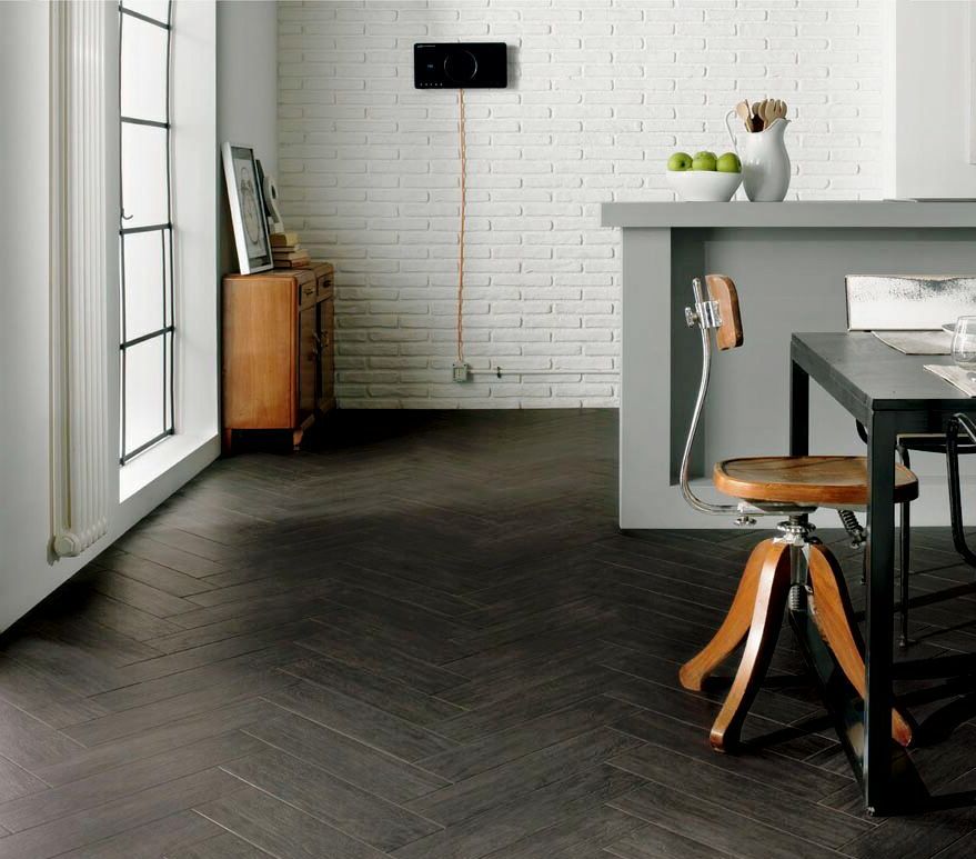 Porcelain stoneware under a dark floorboard creates a very warm atmosphere of a cozy house in the village.