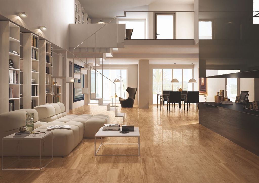 Ordinary tile is rarely placed on the floor in the living room or bedroom, most often it is used for the kitchen, bathroom and toilet. A tile with wood texture, imitating parquet and laminate, can be safely laid in the living rooms in the apartment.