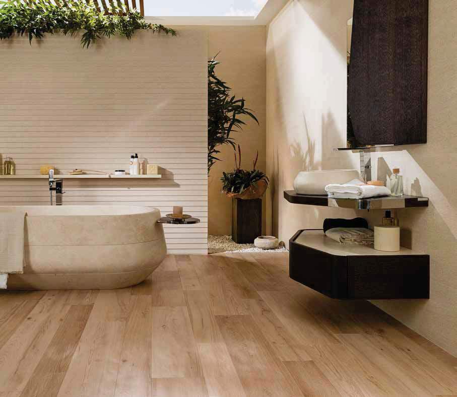 In the bathroom or in the kitchen, you can install wood-textured tiles not only on the floor. But also on the walls. This coating will be not only beautiful and original, but also practical. It is easy to clean, reliably protected from moisture, steam and fungus.