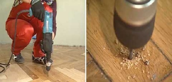 To quickly repair the creaking floor, you must first find the place that responds to movement with a creak. The easiest way to eliminate squeak - Screw a screw into the parquet panel to a depth of no more than 5 cm. If the parquet is attached to the base with mastic, then it is necessary to use a building dryer and heat the “creaky” place. After that the level of the parquet should be pressed down with something heavy.After cooling the floor squeaks should disappear.