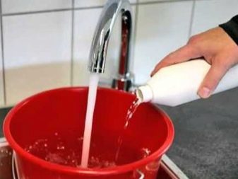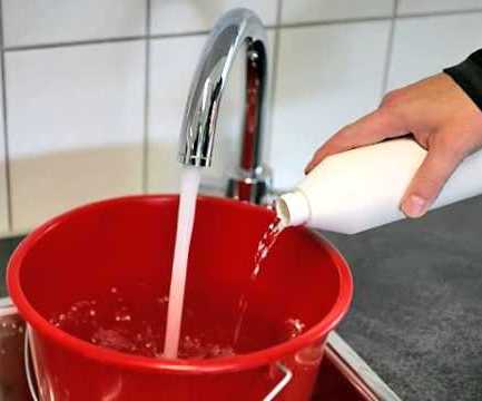 - Another solution that can be created at home is basically vinegar and any foam for the bathroom. At the base of the foam must be surfactants. You will need to take five liters of water, a tablespoon of regular table vinegar and a few caps of detergent.