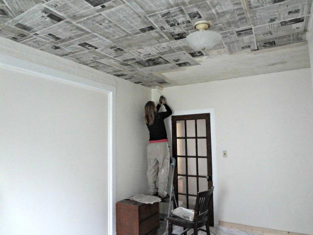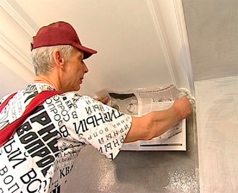 - Glue Underlies the next trick, which is popular with builders. It is applied to old newspapers, which are then applied to the ceiling. It is important to keep one corner of the newspaper dry. We pull over this corner, and the newspaper departs along with the old decorative covering. This tool is better to use to remove a small layer of whitewash.