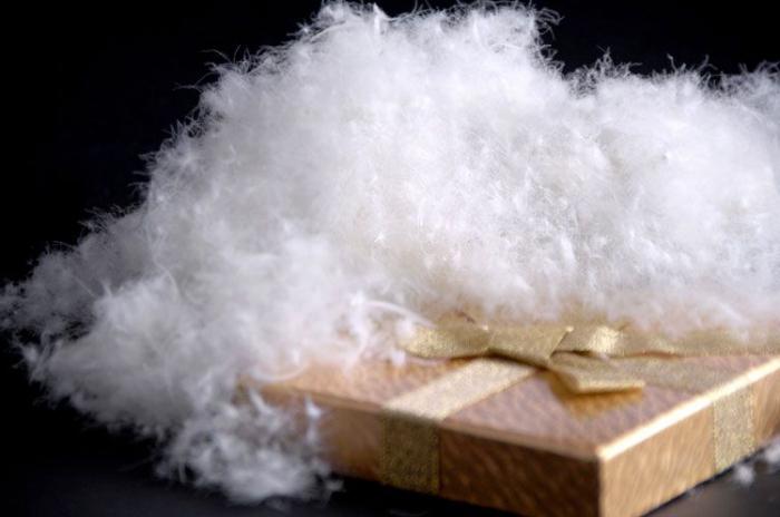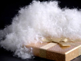 Swan down is an artificial material. This modern filler looks like spiraling balls and belongs to polyester fibers. The elasticity and softness of the fiber provides silicone processing material. At the end of processing, the artificial swan down looks like a fluffy ball.