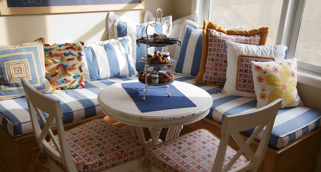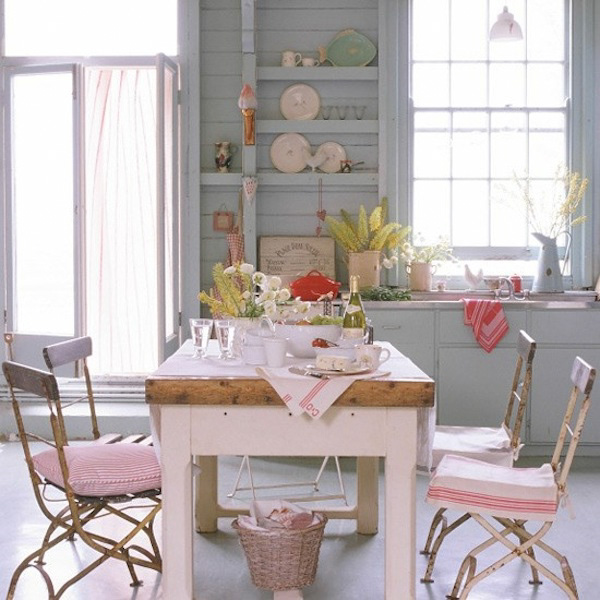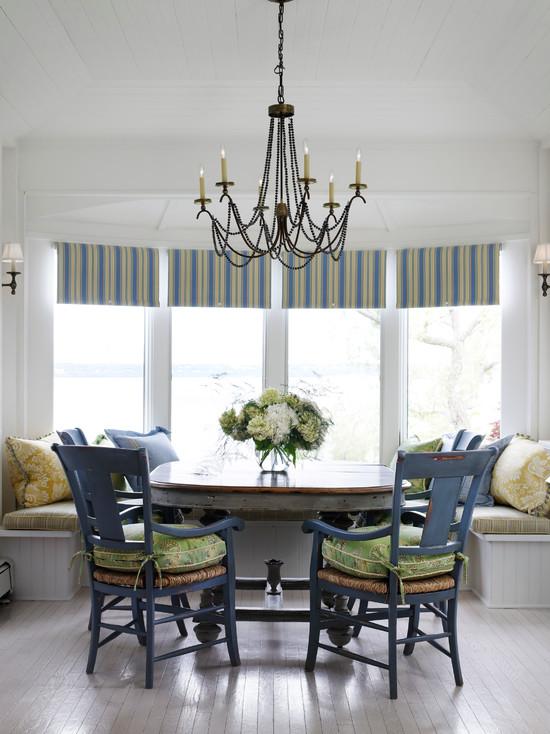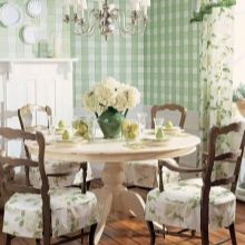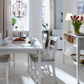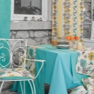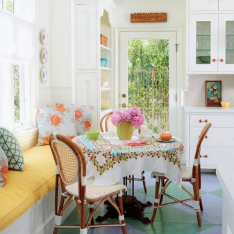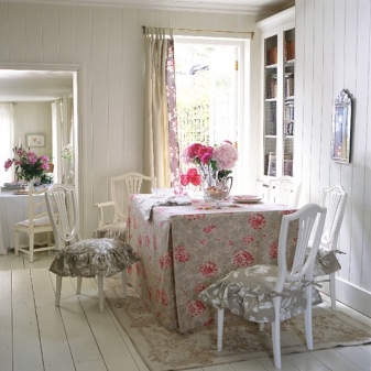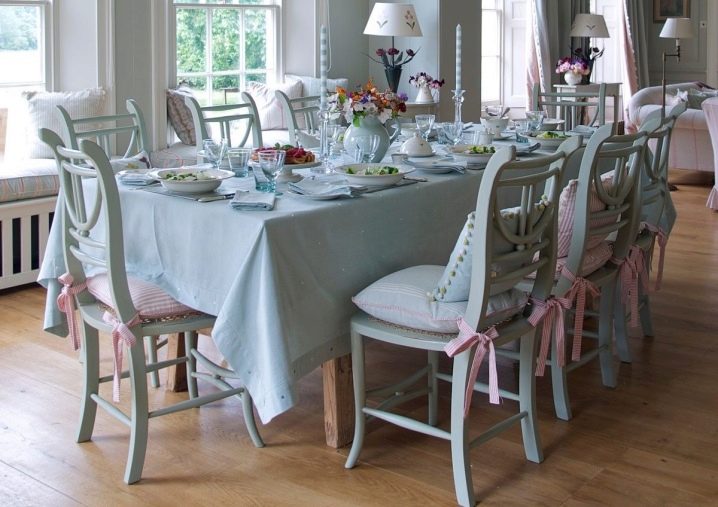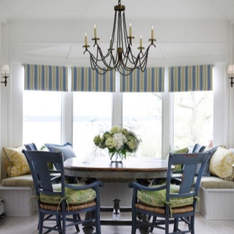 If the Provençal interior uses elements of the nautical style, then white and blue tones predominate in the colors. Cushions lying on the seats of the chairs are sewn with cords to the corners for attaching to the legs.