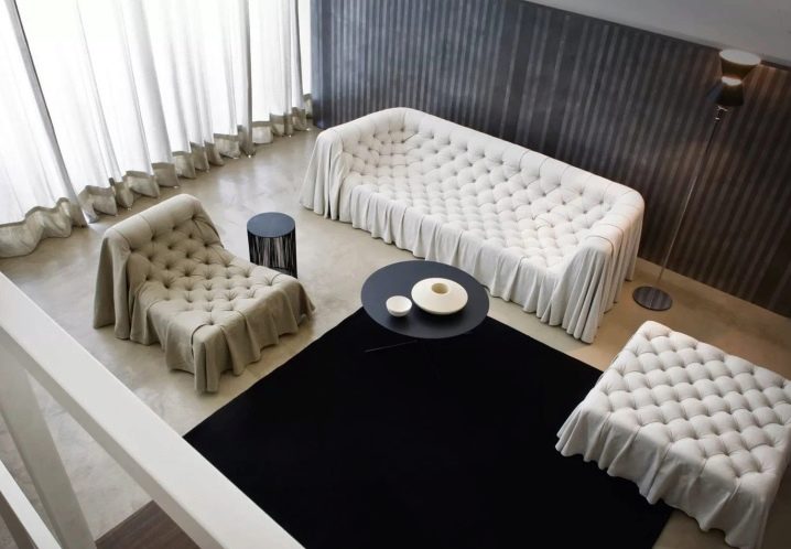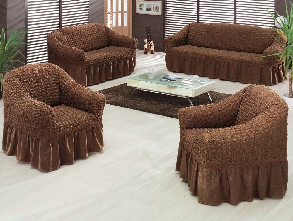One of the differences between the capes on the upholstered furniture is the integrity of the composition.They are not isolated products, but a complete set of one textile with the same finish. In this case, only the size and shape of the capes themselves can be excellent (related to the design features of the sofa and armchairs).