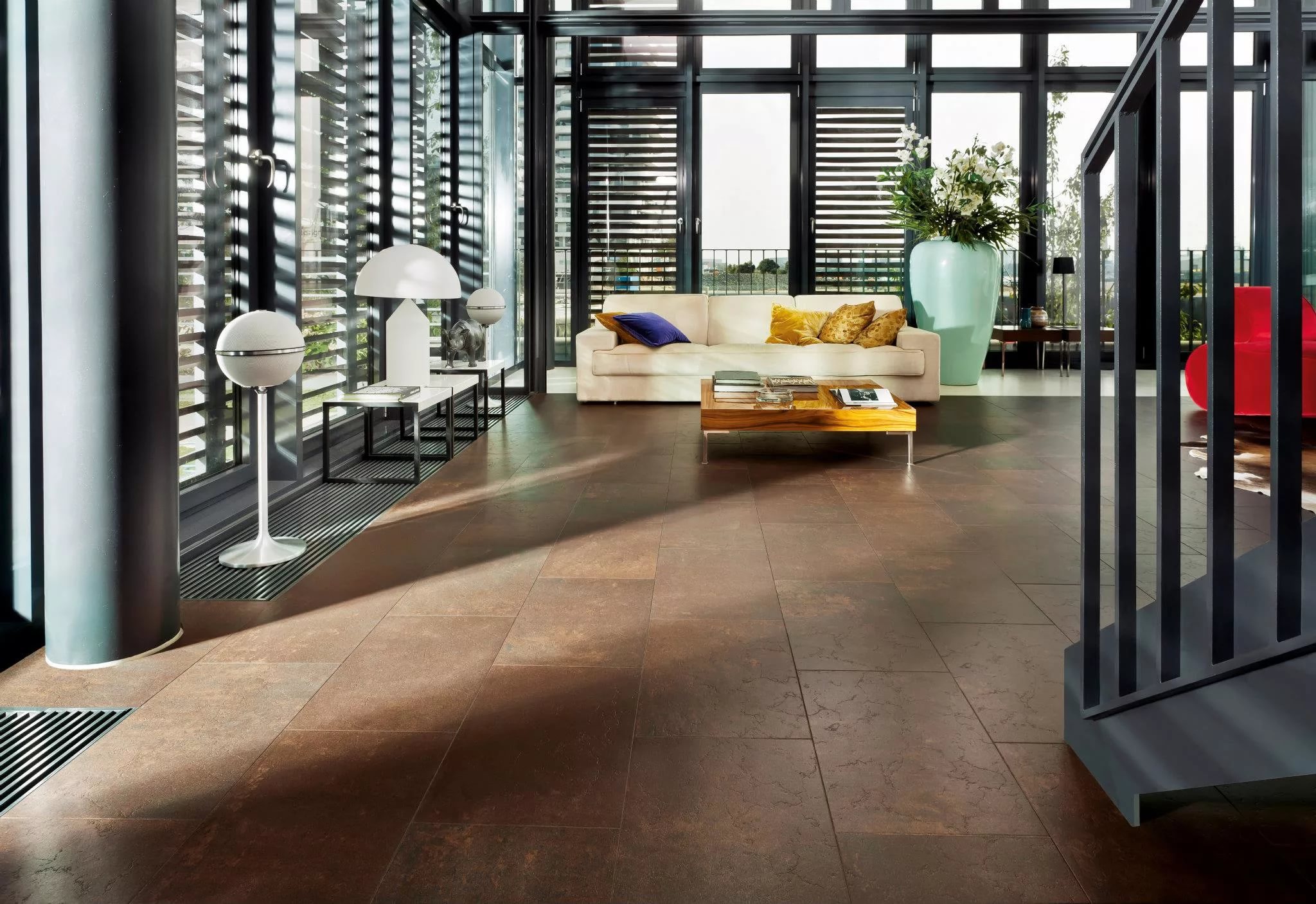 Collection Attikawhich offers a design option for a natural rock stone, is capable of imparting distinctiveness and individuality to any of the modern interiors. Particularly expressive looks like a similar floor in the living room, decorated in the style of postmodernism. The spectacular terracotta flooring combines perfectly with leather and natural wood furniture, as well as with non-standard windows.
