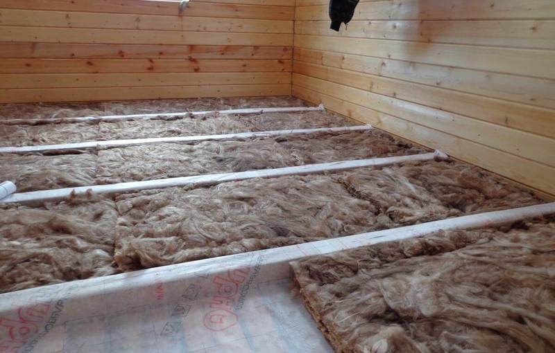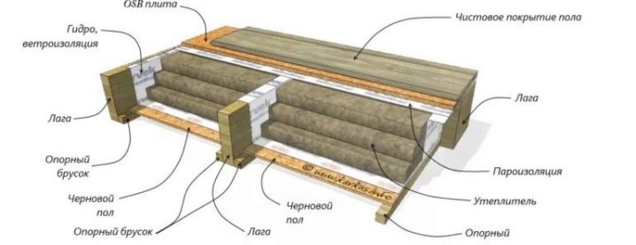 Lags are hemmed with boards, on which the membrane is laid, which prevents the penetration of wind and moisture into the room. In the formed cells fit insulation. Depending on the method chosen, this can be either expanded clay, or foam, polyethylene foam or mineral wool. Insulation covered with vapor barrier. Further actions depend on the preferences of the owners of the house. As a clean floor can be any available options, including water-heated floors.