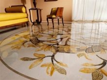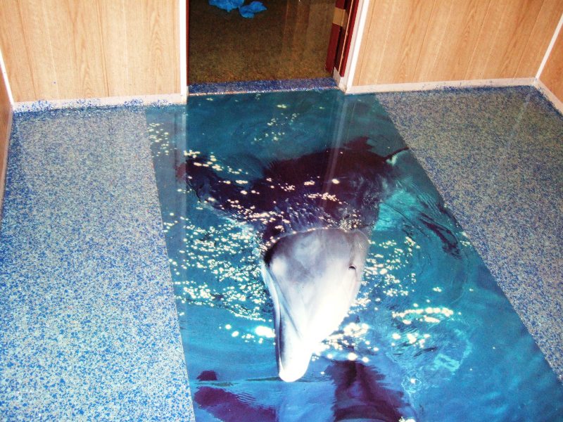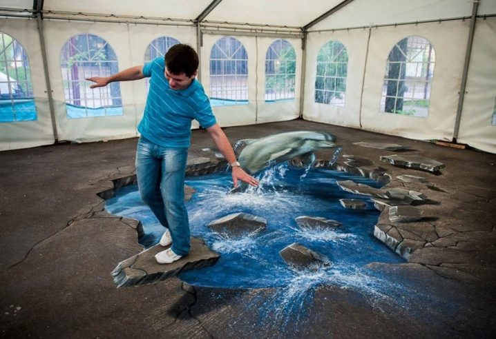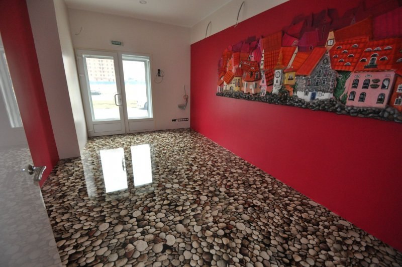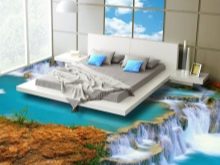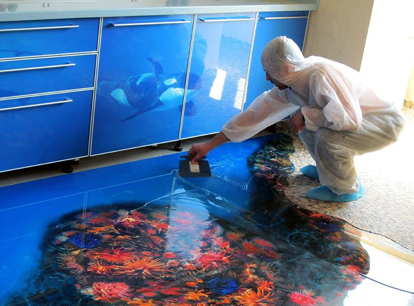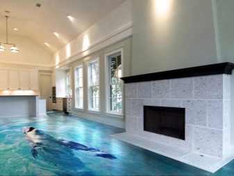 - 3D filler covers - This is one of the new products. In them, the drawing is created in a special way, thanks to which a three-dimensional image is recreated. Such a decorative floor creates the illusion of complete immersion. It can be created both with use of a photo printing, and without it.