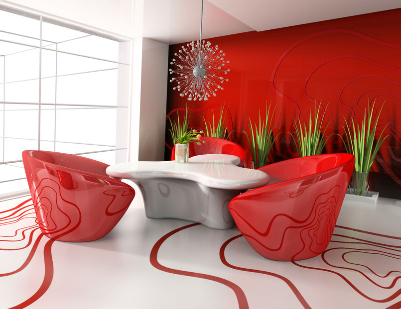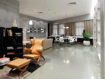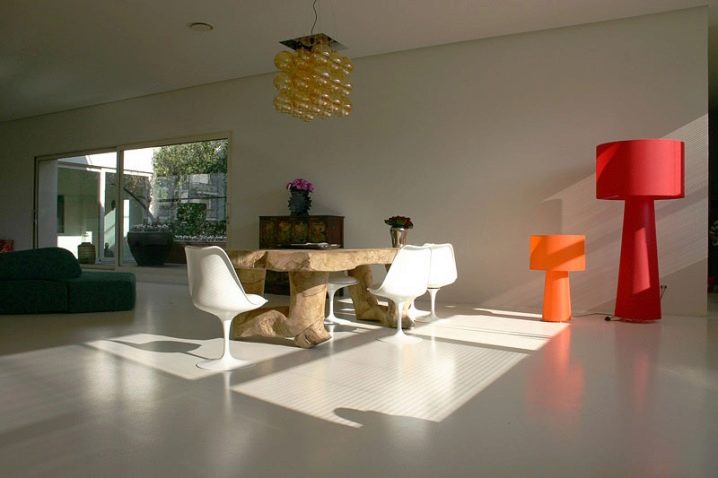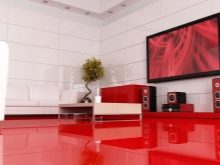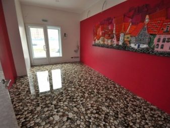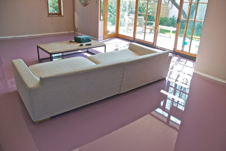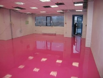 - Bright, glossy, self-leveling floor saturated pink color immediately attracts attention. He makes it clear that this is a room for creative and creative people. Such a floor design is ideal for a dance studio or beauty salon.