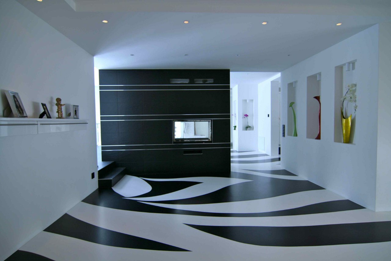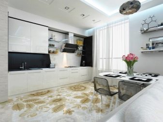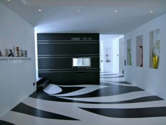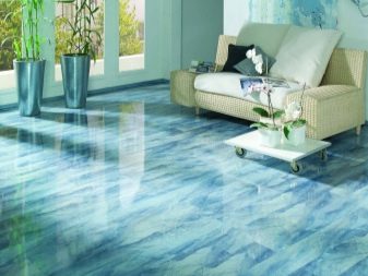 - The highlight of this glossy flooring is an unusual pattern from one edge. Such a liquid coating looks restrained and stylish and testifies to the good taste of its owner.