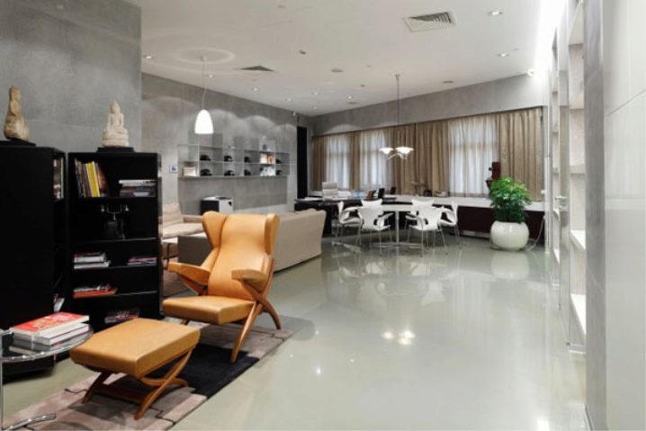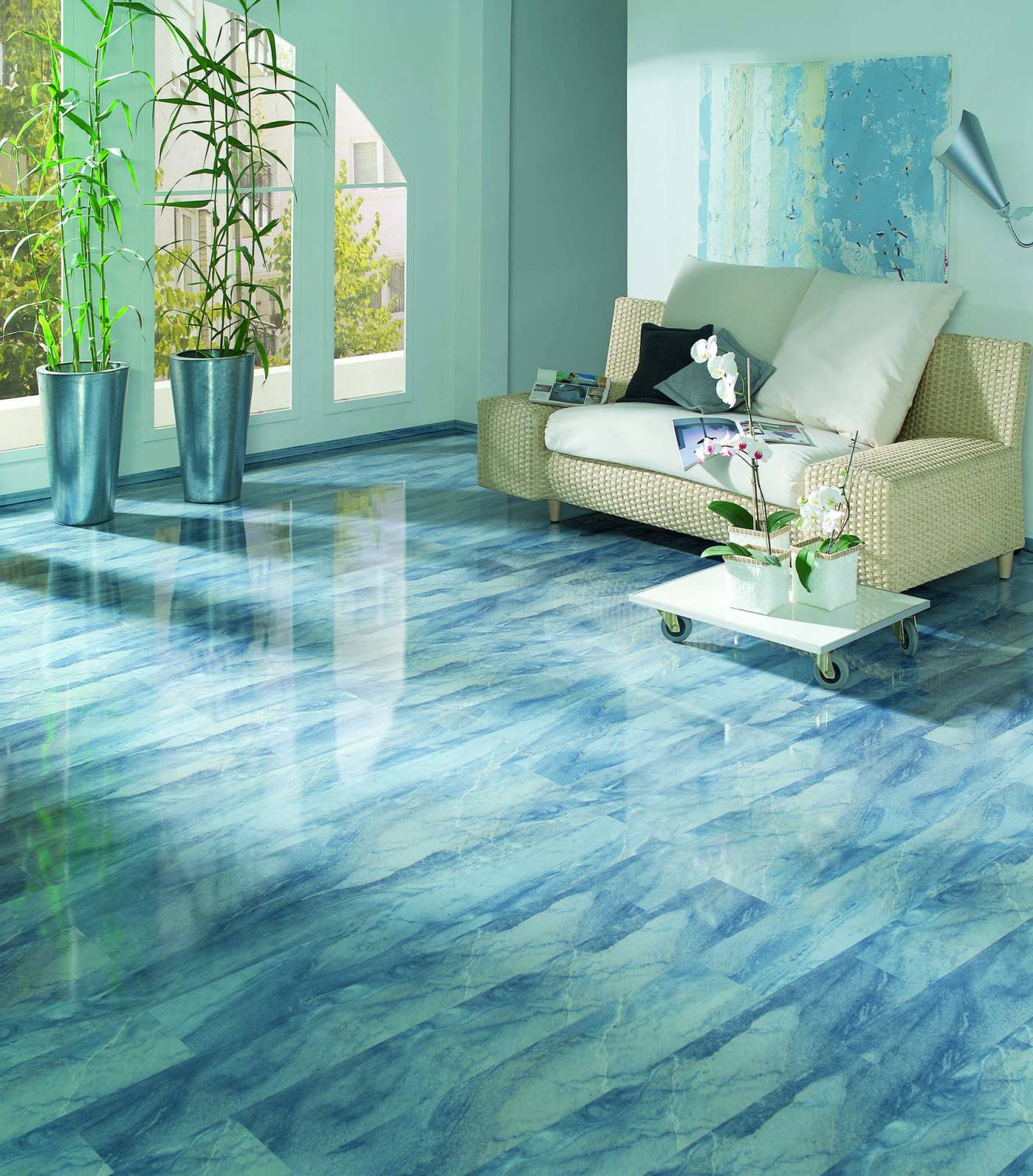 - An ideal example of how a self-leveling floor decorates a room without standing out from the general color spectrum of a room. Natural calm color, thanks to the glossy texture, expands the boundaries of the room.