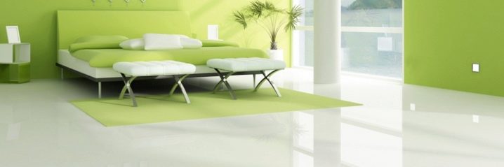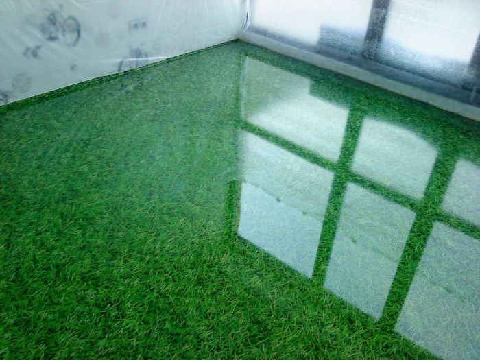 - Bulk glossy floor with imitation grass. It has a bright green color and attracts attention. Makes the room itself more alive and immediately uplifting. On cold winter evenings, just such a floor will allow for a moment to plunge into the warm spring.