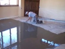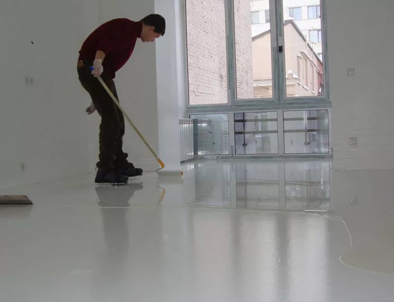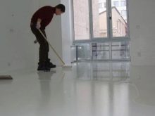 Before pouring, the floor is primed with a conventional paint roller with a long handle. You can use Volma Universal primer or any other for internal deep penetration works.It is enough to process smooth surfaces 2 times, porous at least 2-3 times with an interval of 4 hours. It is necessary to start pouring only after the primer is completely dry.