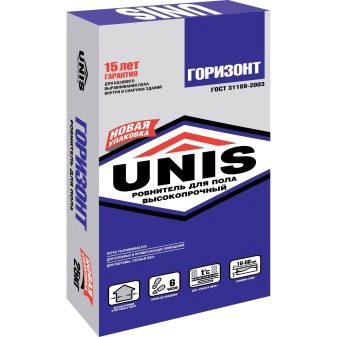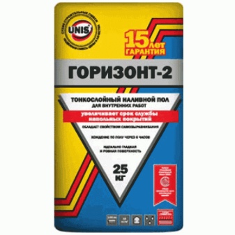 - "Horizon" - a basis for a floor from the Russian producer. Available in packs of 25 kg, designed for basic leveling layer of 10-50 mm. It is not recommended to flood the completed casting, or to allow the ingress of sunlight on it, as this contributes to premature drying.Specifications are as follows: