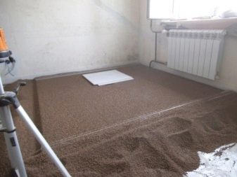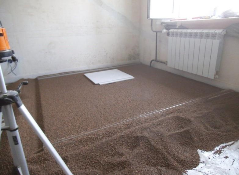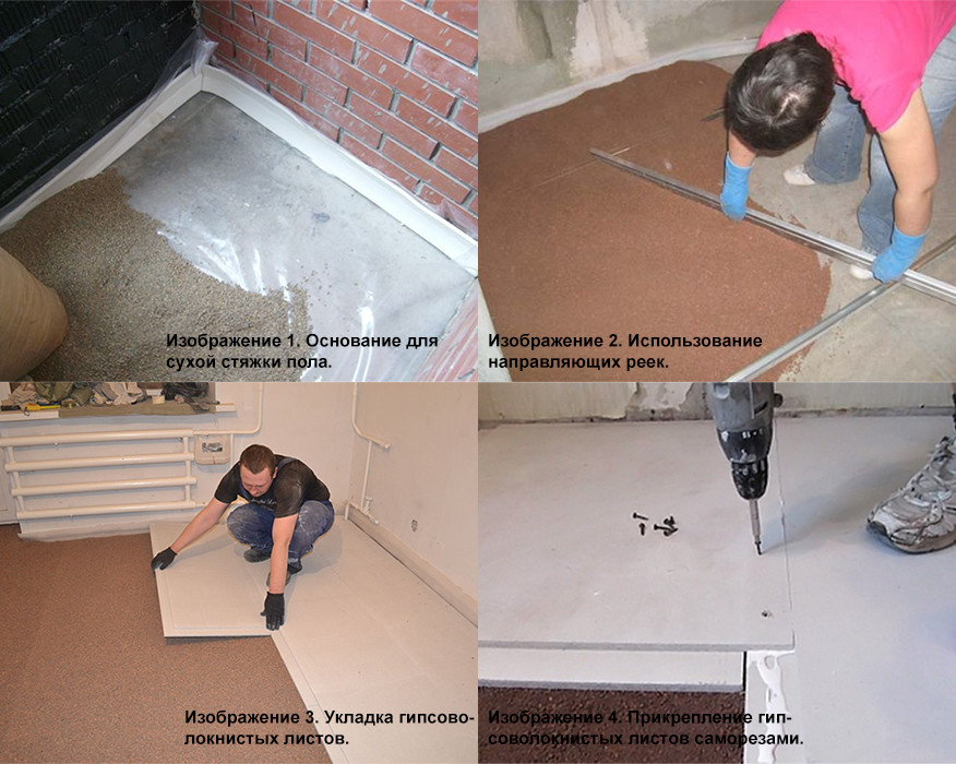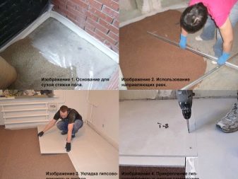 The next step should be to fill the dry mix, as which you can use expanded clay or quartz sand. The thickness of the backfill varies from 2 to 12 cm and depends on the type of structure and the quality of the base. Next, you should lay the sheets of the material of the tie, glue them with tile glue and fasten with screws.
