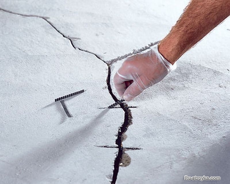 Further crack must be filled with repair compound to half its depth and a metal bracket is installed. To increase the strength of the solution, you can add quartz sand. After filling the main cleft, it is required to fill the solution with transverse grooves and remove the excess solution. Then you need to wait until the repaired surface is completely dry and proceed to sanding it.