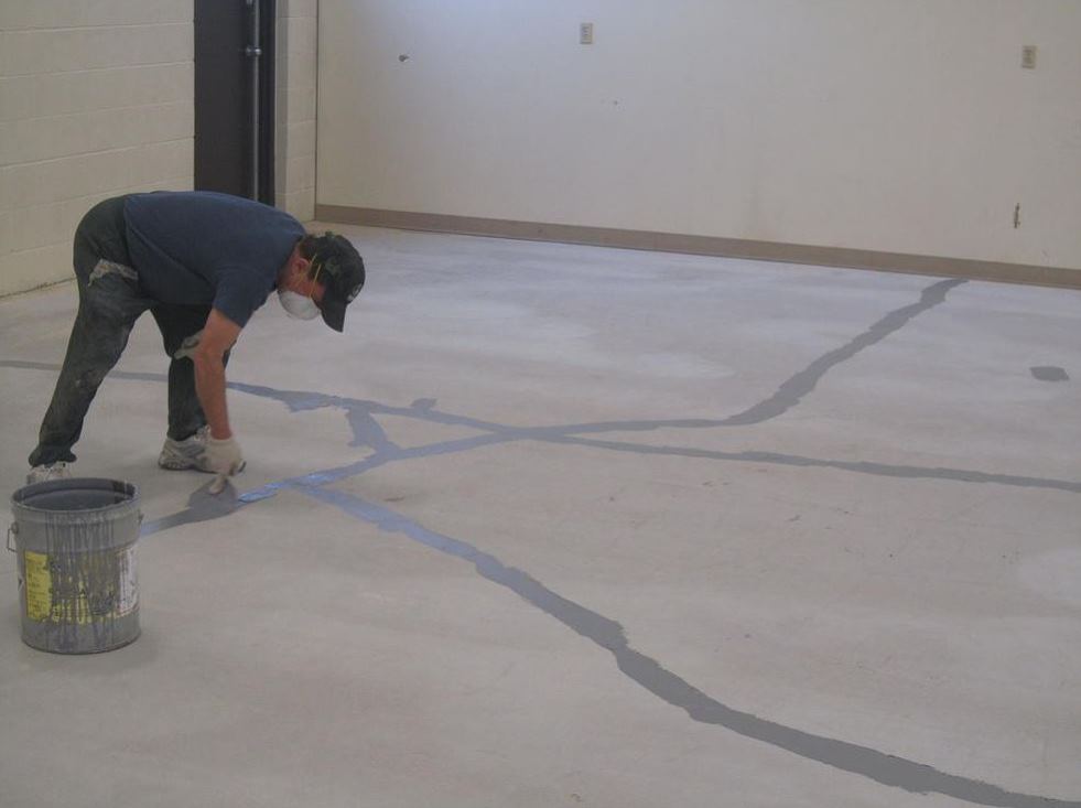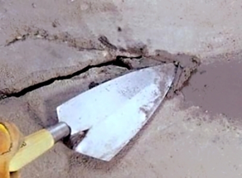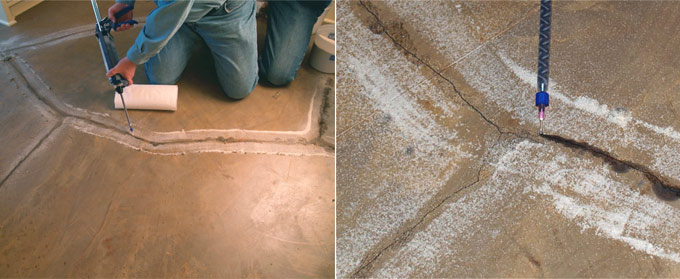 When repairing deep cracks, ream their cavity to the full depth of the screed. When forming the transverse grooves at the ends, you need to drill holes 2-3 cm deep. It is necessary to fill a deep crack in several steps, giving each layer the time to harden to the maximum. The first batch of the mixture should be made slightly more liquid. This will allow it to penetrate the most inaccessible places at the base of the floor and evenly fill them. The next batch should be of medium thickness, it should be poured into the crevice to the level of transverse grooves.