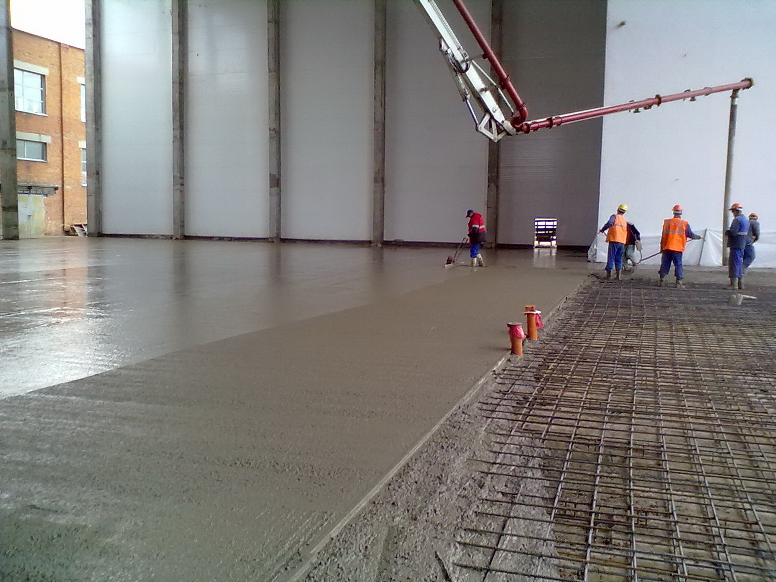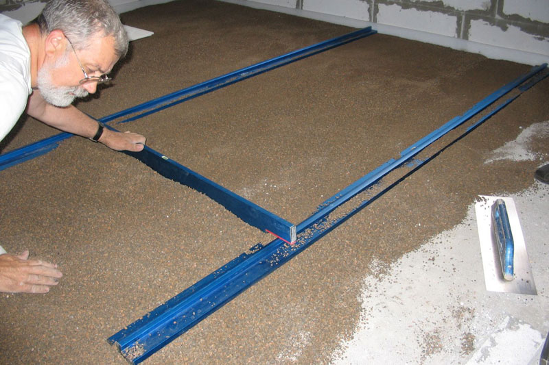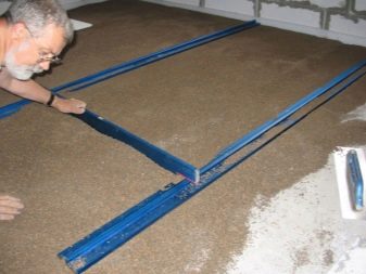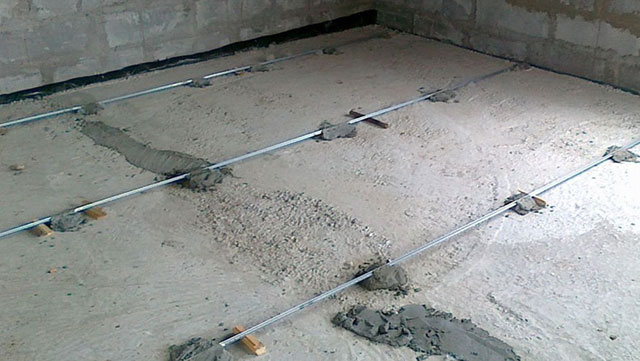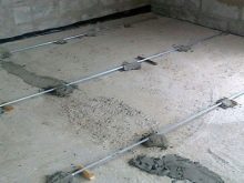 Lighthouses from wooden slats and steel pipes must be removed from the partially stiffened screed, and the resulting grooves covered with the same solution. When screed on the ground, steel pipes with a diameter of up to 70 mm are used. Instead of pipes, you can use a steel profile of rectangular cross-section.