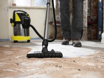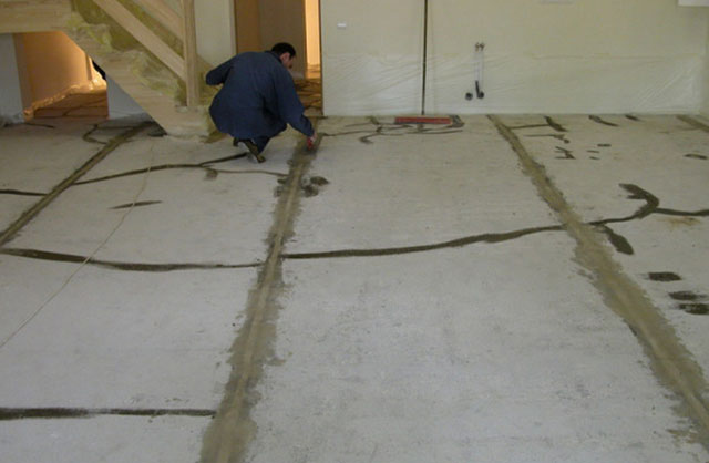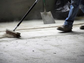 After cleaning debris you need to clean the surface with a grinder or brush. Remove crumbling concrete, residues of glue, mixtures and stains. To do the cleaning with a vacuum cleaner and degrease the floors with soapy water or solvent. Small cracks, chips, gouges and floor joints with walls should be embroidered up to 5 mm, primed and covered with a thin layer of putty based on resin or glue. To correct major defects, it is better to use a cement-sand mortar or a self-leveling mixture.
