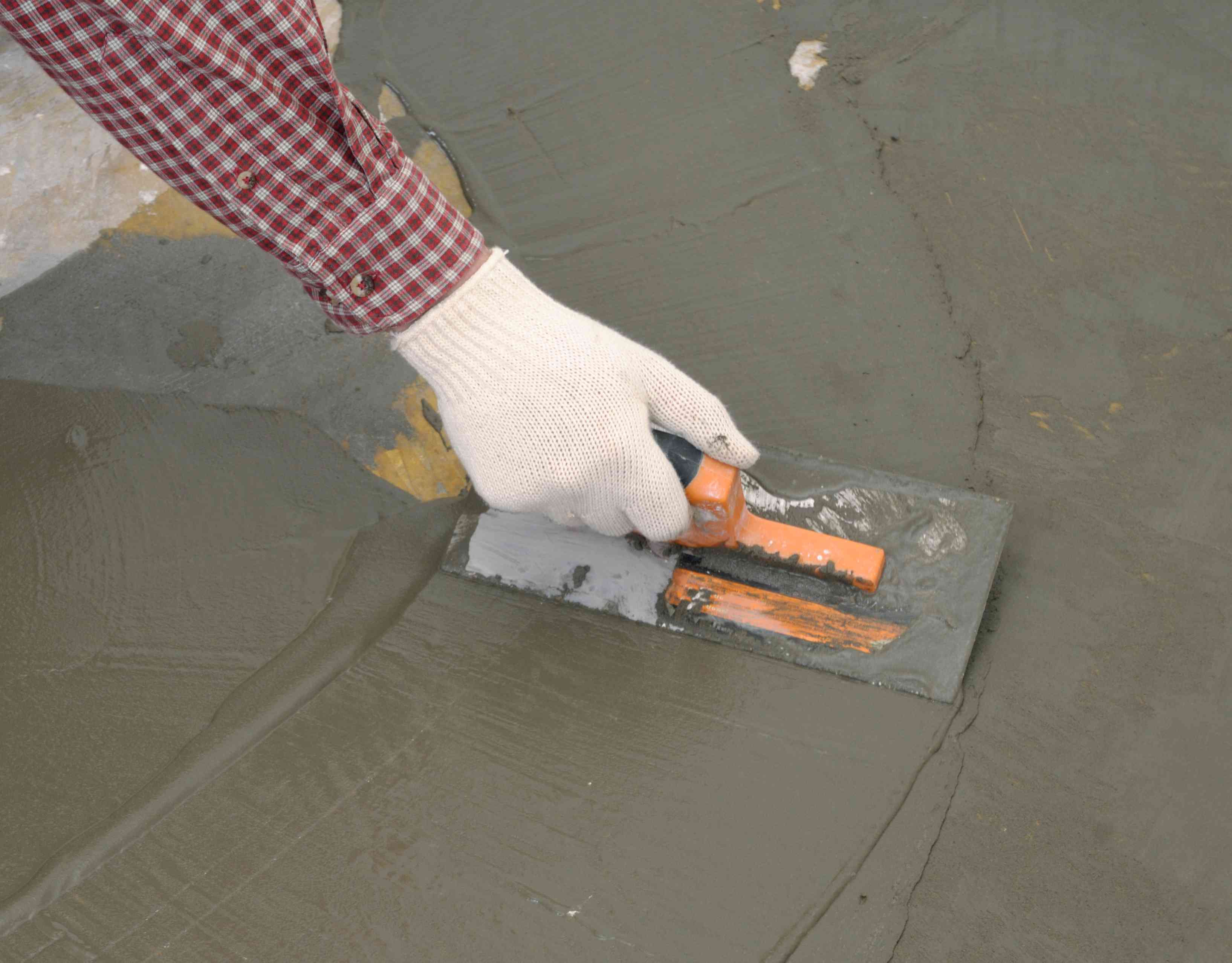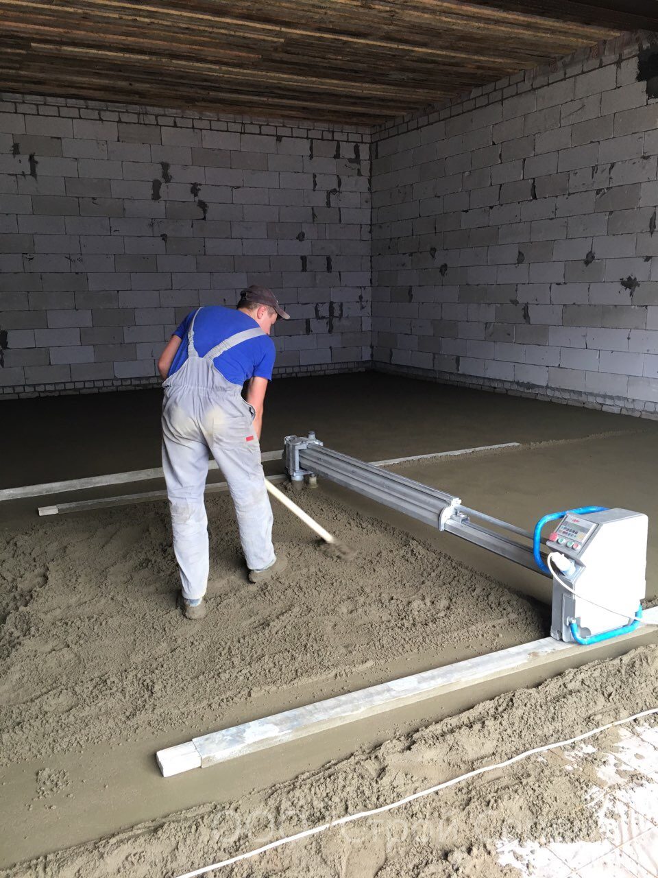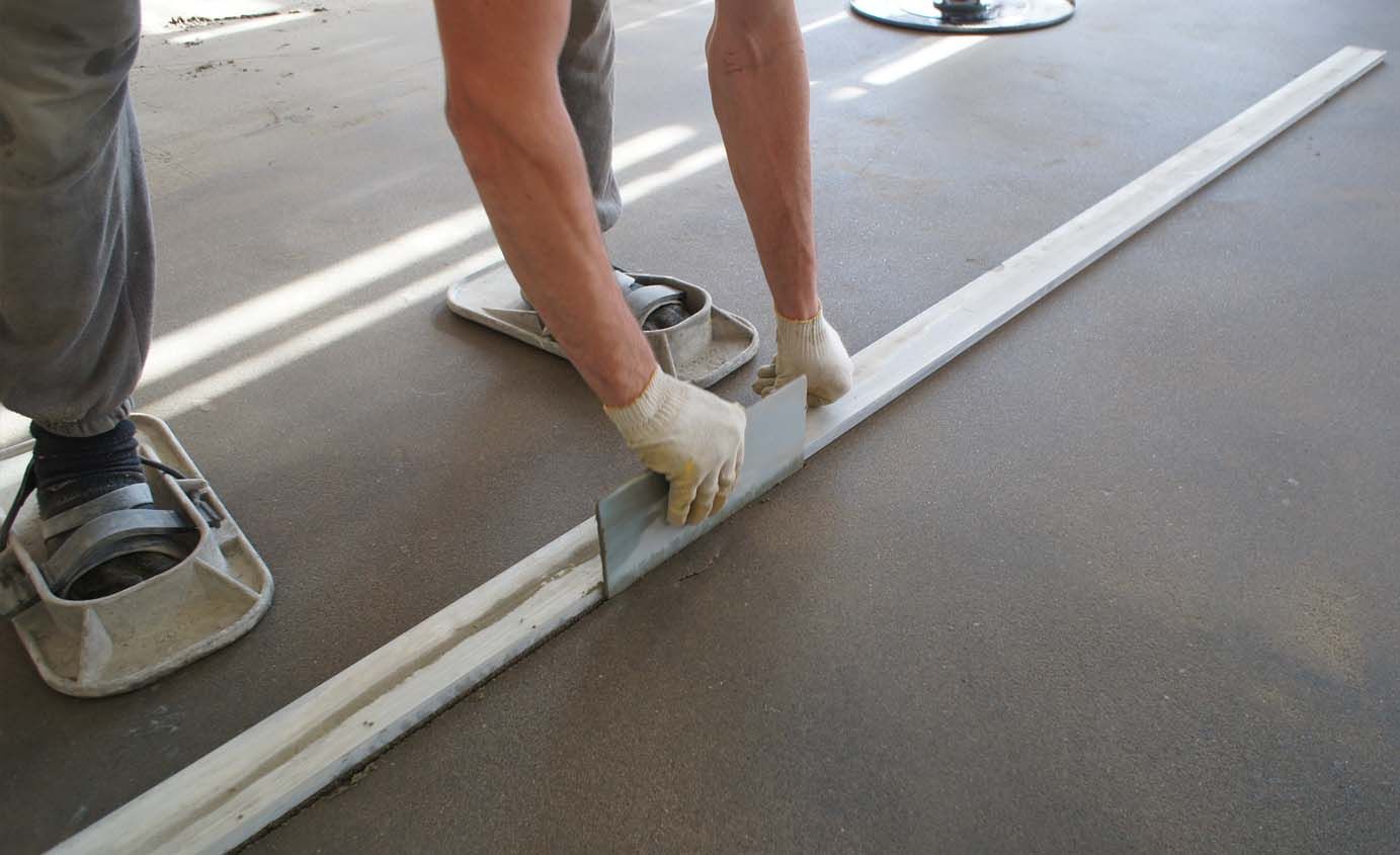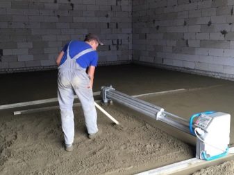 The screed is leveled with a spatula at the walls and in hard-to-reach places. Work can be stopped only when the whole room or the enclosed area is made. When the concrete is grabbed and can withstand human weight (after about 12-20 hours), you need to remove all the bumps on the surface of the screed and the beacons.