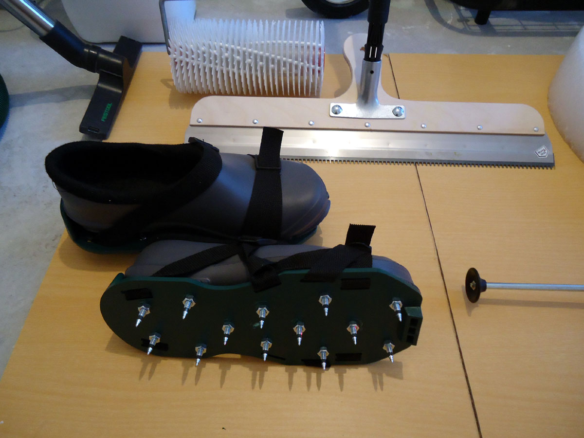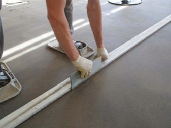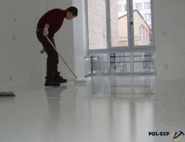 Filling of the floor starts from the corner of the room farthest from the entrance. Leveling is made by squeegee or spatula. Between pouring strips need to withstand a period of time not more than 10 minutes. Walking on the poured floor is possible only in the paint spikes. Next you need to remove the bench beacons and roll the entire surface with a needle roller to remove all air bubbles.
