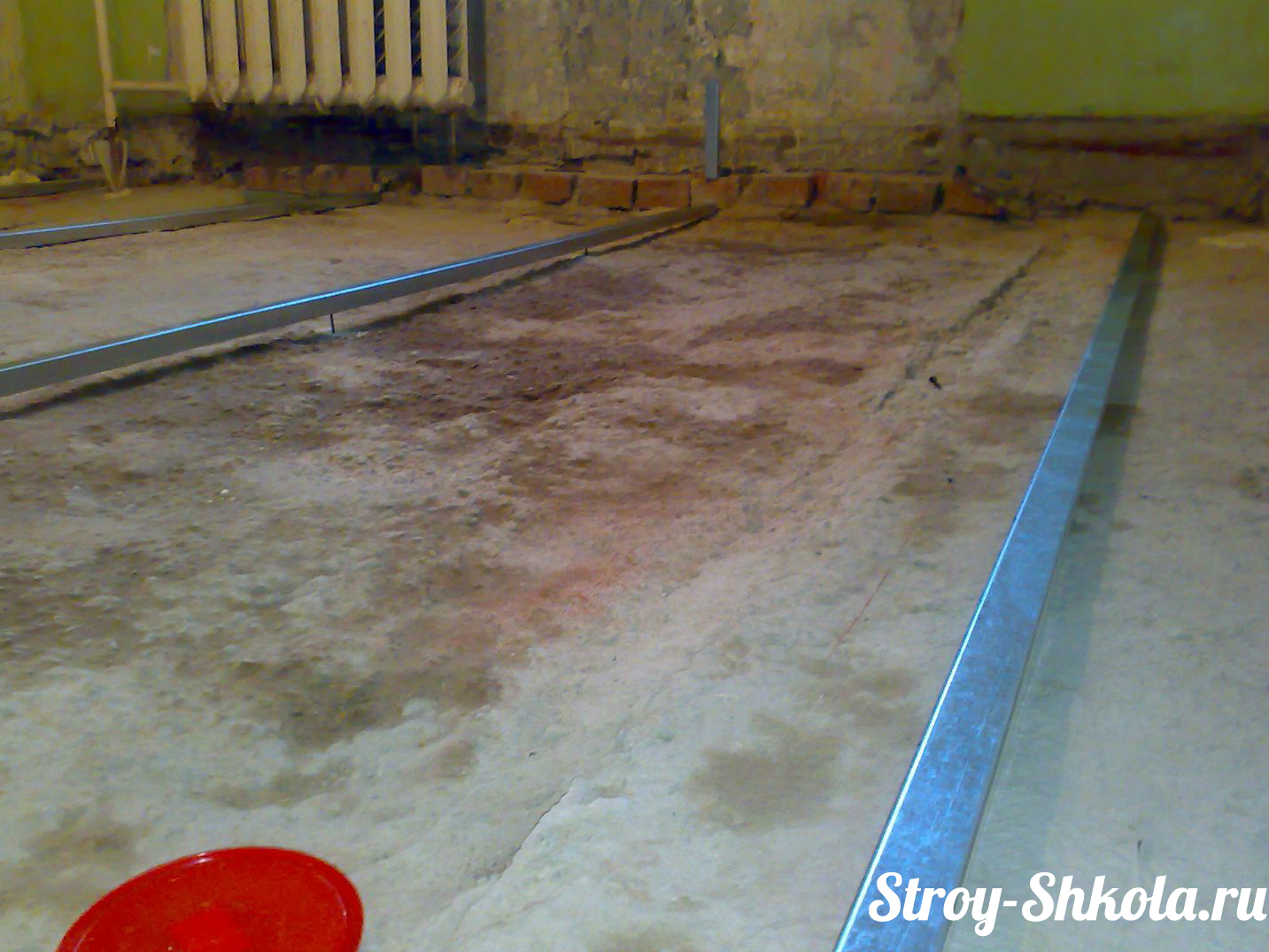 Lighthouses It is possible to use a T-shaped aluminum profile, round or rectangular pipes made of steel in a diameter of up to 70 mm, wooden slats, dowel-nails. It should be borne in mind that the pipes and slats are removed from the partially frozen solution. If the screed is performed by self-leveling mixtures, the beacons may not be needed, or special reference beacons are used.