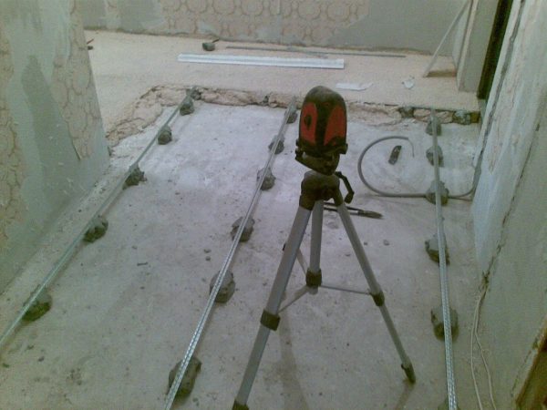 It is necessary to place lighthouses along one of the walls of the room so that the distance from the lighthouse to the wall is no more than 10 cm, and the step between them is a quarter less than the length of the rule. After placing on the floor surface, the profile must be leveled using a laser or building level on the marks of the highest point of the floor. When leveling, the lighthouses are pressed closer to the floor or raised with the help of pieces of brick.