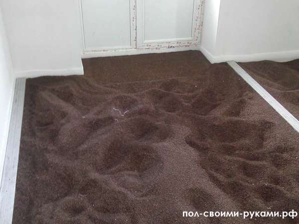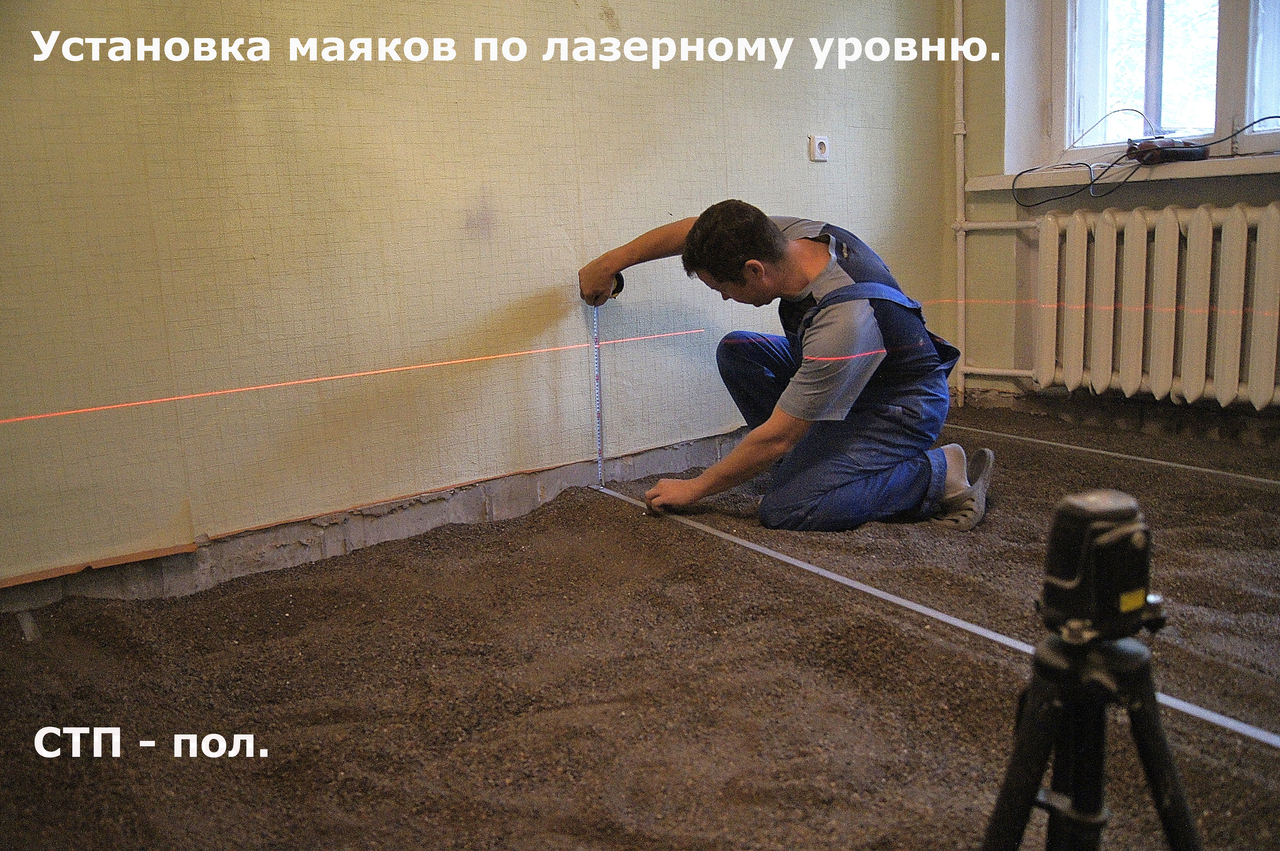 After the lighthouses are exposed, it is necessary to once again check the evenness with the level and, if necessary, correct it. A large room is recommended to be divided into several sections by continuous beacons so that you can take a break in the process. A solid beacon or fence is always installed on the threshold of the room. Thermal insulation material should be laid between the lighthouses, and after drying the beacon mounts, you can begin to fill the screed.