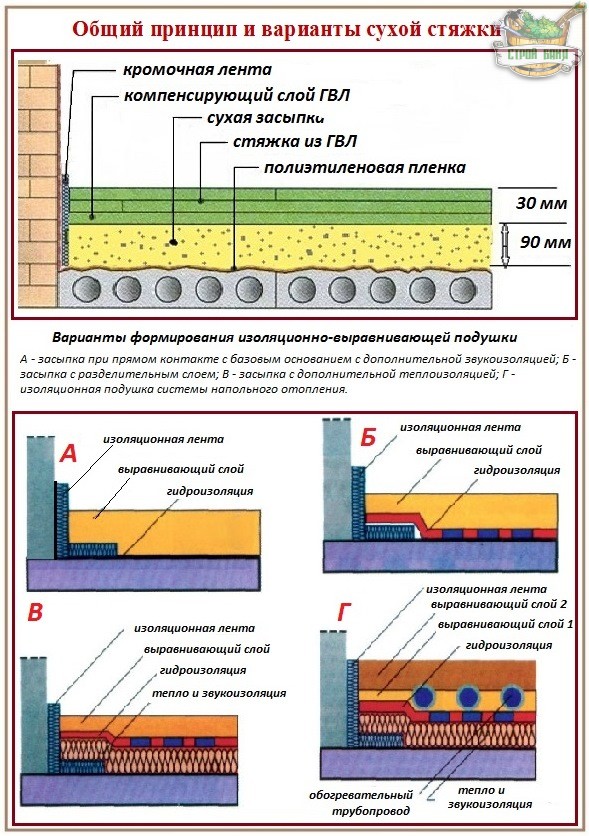 Dry screed - These are large sheets of drywall or plywood, which are laid on a layer of bulk materials, such as polystyrene or expanded clay. Further work on such a screed can be started immediately after its installation.