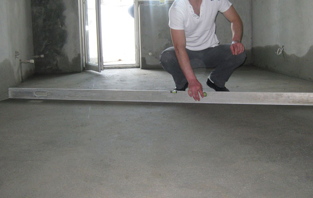 It will not be superfluous to check the result of the work. To assess the flatness of the coating, you can use the construction level, applying it to the floor in different parts of the room. The allowable gap is 4 mm. The presence of voids inside the screed is checked by tapping with a wooden block. The sound around the perimeter of the room should be the same - hard and ringing.