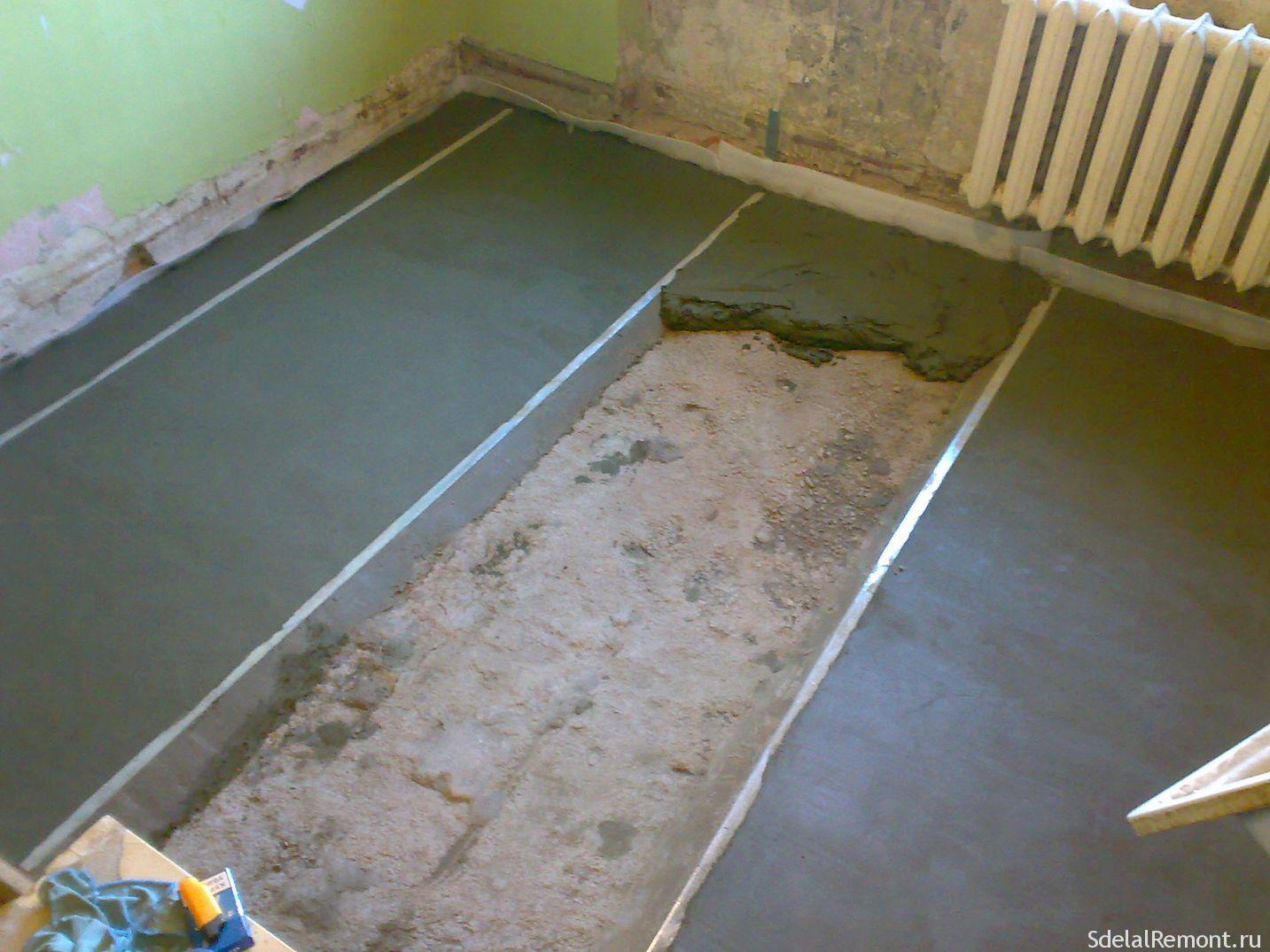If the elevation difference in the room exceeds 4 cm, then it is necessary to choose a starting level for the draft layer of the floor. Cement-sand and concrete composition is always placed on the beacons. In rooms with high humidity, such as a bathroom, toilet, kitchen, work with cement-based solutions. In living rooms it is possible to use screed using gypsum.