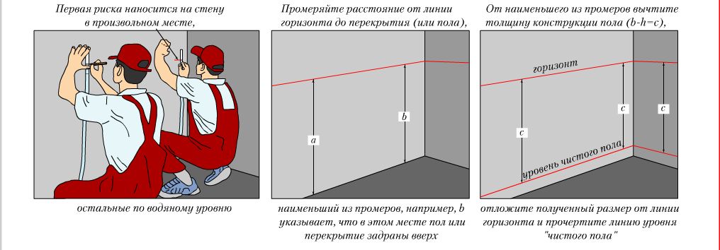 Using the same batten, mark the highest point of the floor around the perimeter of the walls and draw a control line on them. The wall should be cleaned of plaster 0.2-0.3 cm above the marks made.