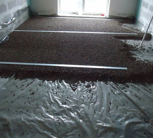 In some cases, materials with a heat insulating effect are laid over a layer of waterproofing. This is a mandatory procedure for the device screed on the ground and for the construction of floor heating systems. You can choose from the usual bulk materials such as perlite, expanded clay, gravel coating or coarse sand. Some prefer insulation in the form of plates, which can be made of mineral wool, polyurethane foam or extruded polystyrene foam - penoplex.