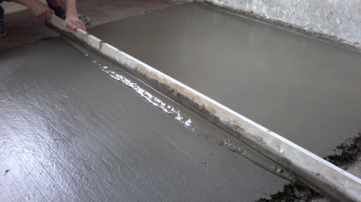 Starting from the farthest wall from the entrance, the solution is laid out between the beacons and leveled by the rule. It should be perfectly smooth, without chipping and cracks on the working side. Slightly pressing, the mass needs to be pulled onto itself, making leveling movements to the left and to the right. To remove air bubbles, the solution should be pierced with a shovel or metal rod. You can use a special deep vibrator. They are treated with a surface until cement milk appears on it.