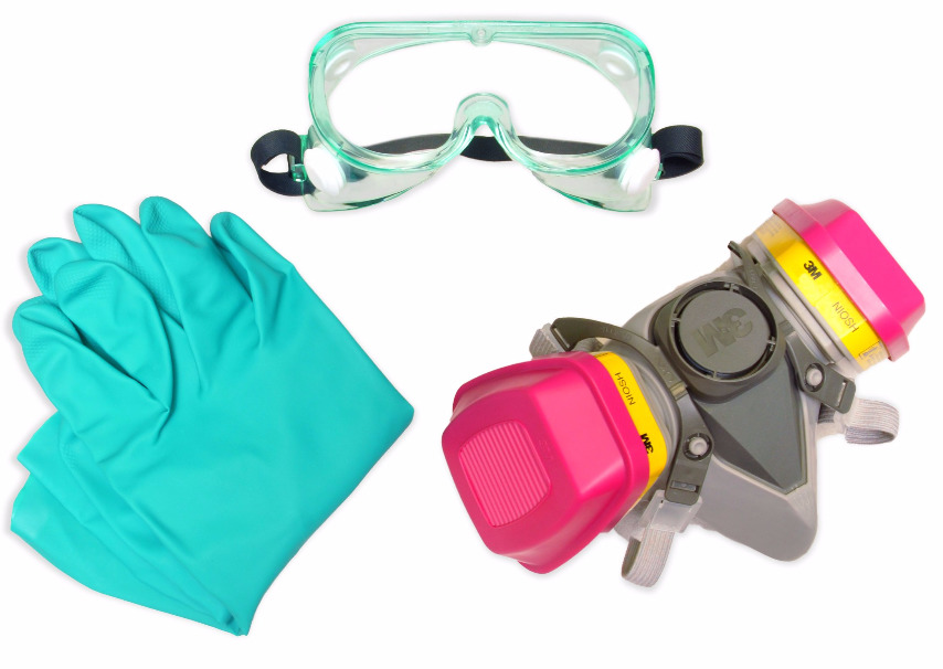 Construction gloves, respirator, goggles. To protect the skin, respiratory system and organs of vision.