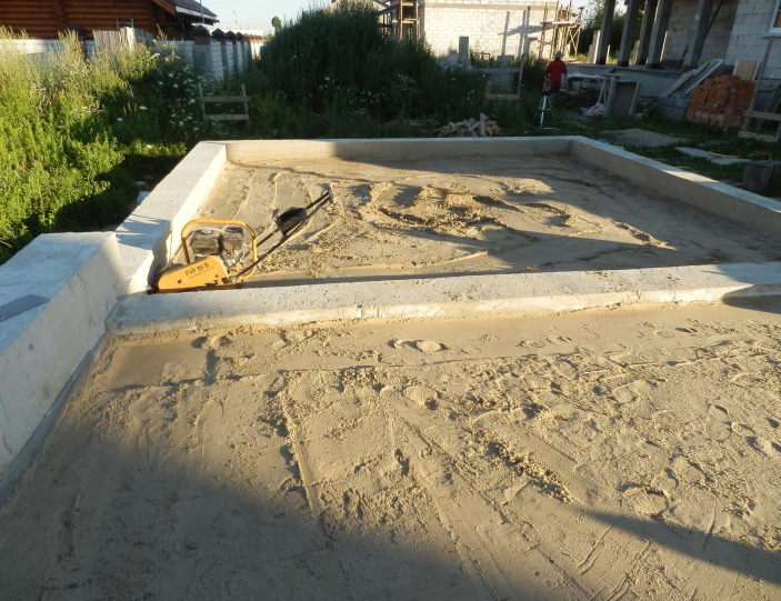 The most difficult is the preparation of a soil base. First of all, you need to remove the top layer of soil, the thickness of which can reach 40 cm. In cases where the distance from the soil to the leveling mark of the screed is more than 35-40 cm, pour a layer of sand of the desired thickness. After that, the entire surface is carefully tamped using a special vibrating machine or a heavy log with a length of 1 meter. The surface is considered sufficiently rammed, if it does not leave traces of shoes.