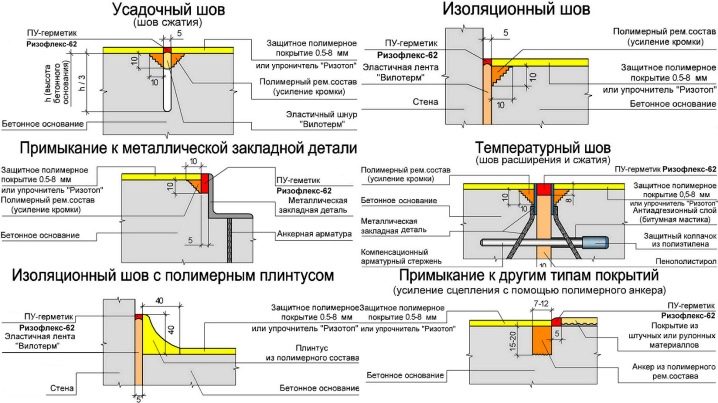 To prevent cracking of the screed, deformation joints can be cut into it.The depth of such joints should be equal to 1/3 of the thickness of the concrete. Cutting is made on the hardened, but not fully frozen concrete. After complete drying of the screed, the seams are filled with sealant. There are three types of stitches: